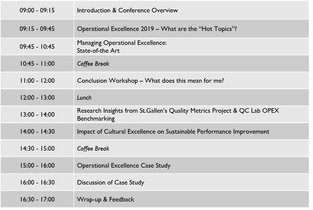 We would be delighted to welcome you at one of our St.Gallen Operational Excellence and Quality Metrics Conference events. We will certainly have several participants from big and small pharmaceutical companies and the exchange will for sure be beneficial for all participants. Below you will find further information regarding the agenda, dates and participation fees, and also the opportunity to register.